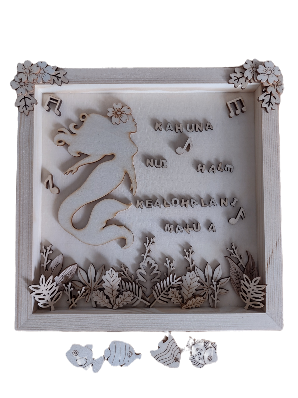 This collection shows the process from unfinished to a completed Whimsical Whimsy Scene. Showcasing a Hawaiian themed Whimsical mermaid wooden art scene with a beautiful Hawaiian phrase, colorful sea creatures and decorative floral accents.